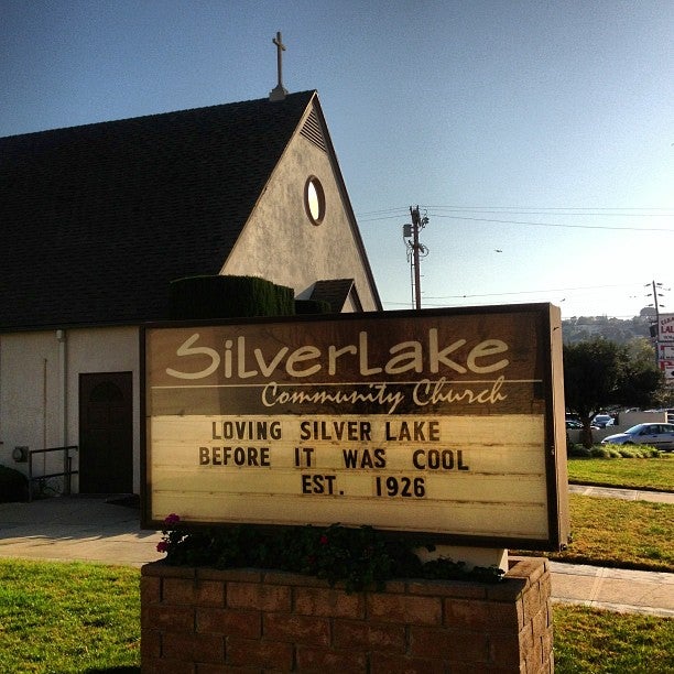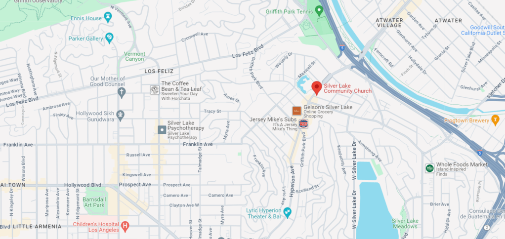 La Iglesia Comunitaria de Silver Lake está ubicada en la esquina noreste de Hyperion Avenue y La Paz Drive, una cuadra al norte de Rowena Avenue.